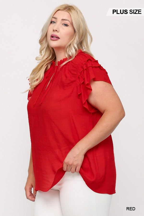 Triple Ruffle Sleeve V-Neck Top with Front Tie