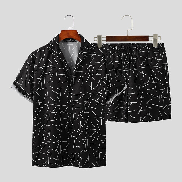 Men Hawaiian Sets Printing 2021 Summer Short Sleeve Button Shirt Beach Shorts Streetwear Casual Mens Suit 2 Pieces S-3XL INCERUN