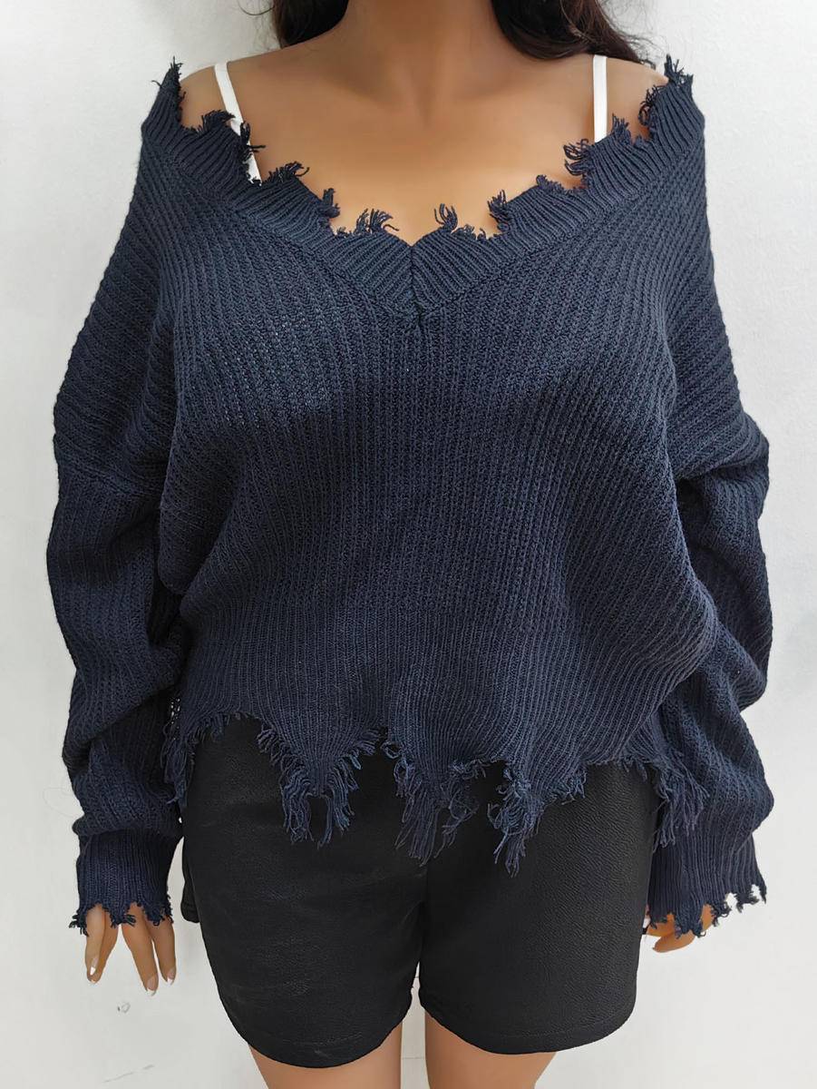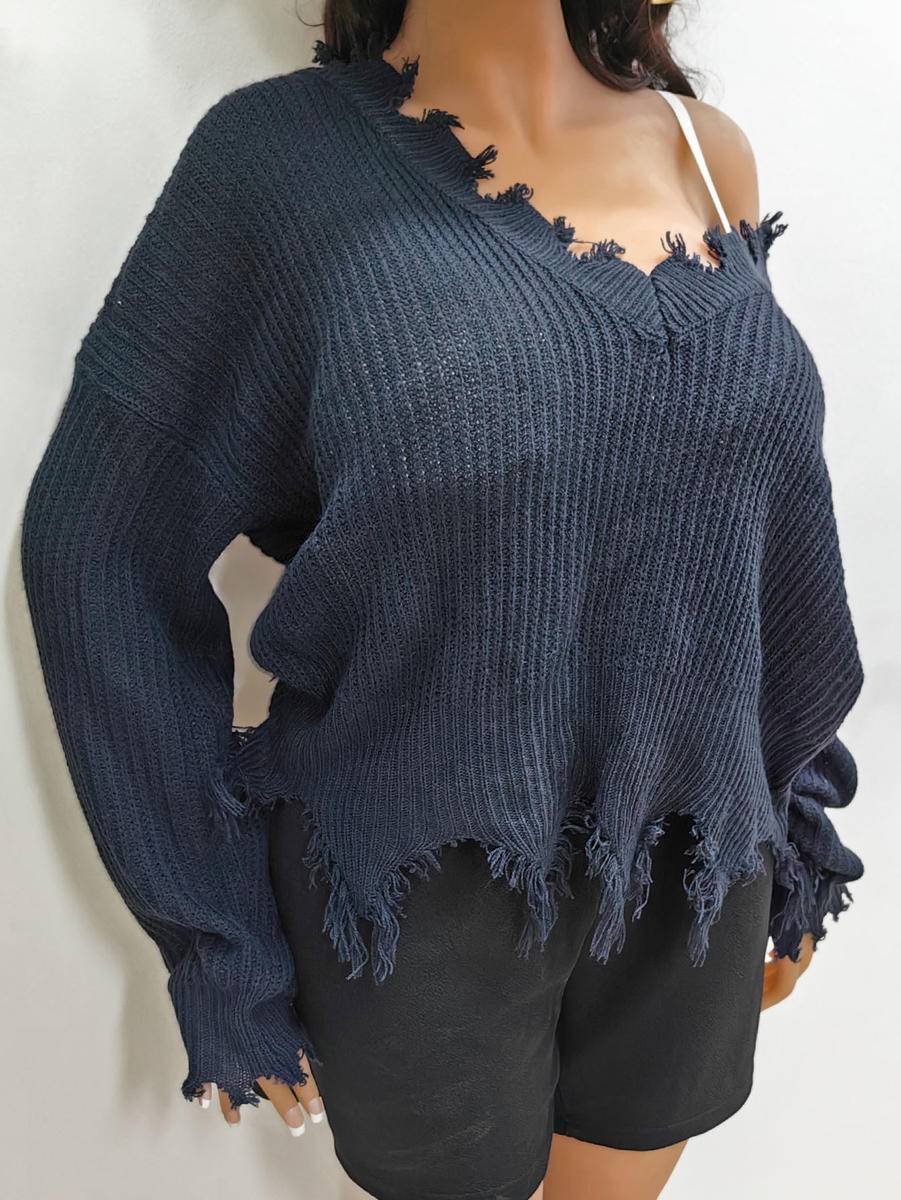 Solid Plus Size V Neck Long Sleeve Raw Hem Sweater
